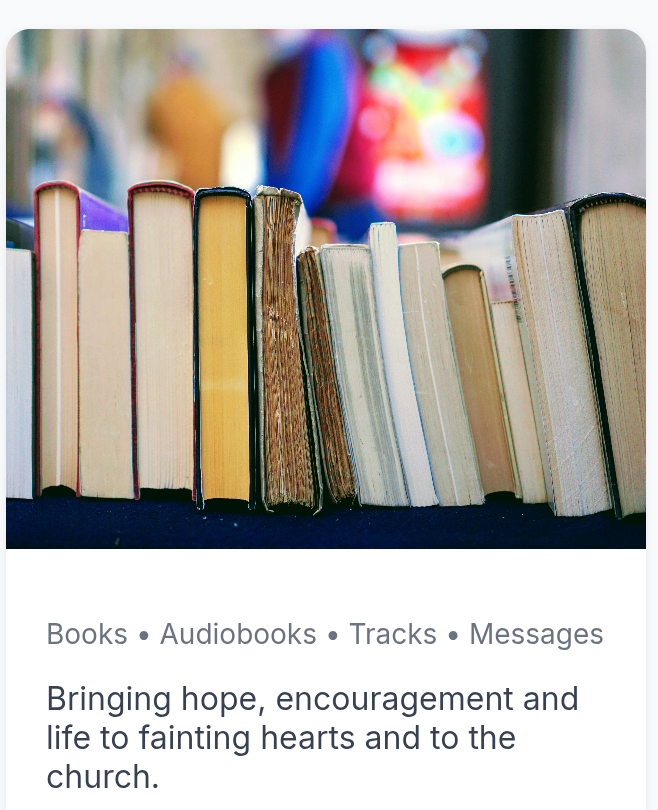 Blessing lives through books, tracks, audiobooks and messages — bringing hope, encouragement and life to fainting hearts and to the church. Amen.